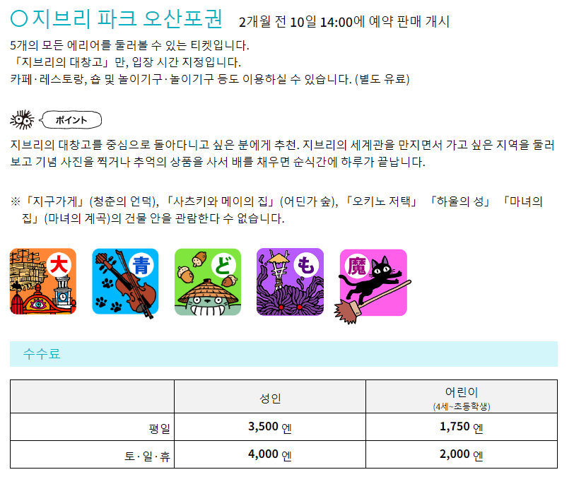 지브리 파크 티켓은 어디를 관람할지에 따라 가격이 달라요!